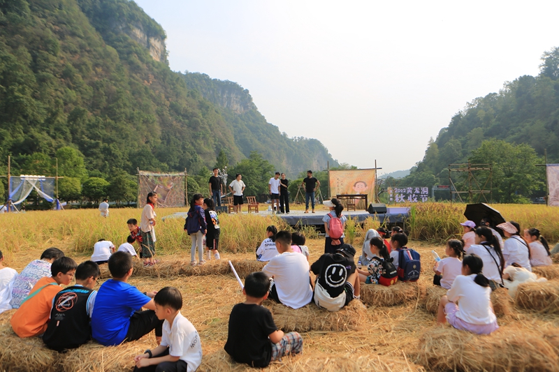 除了稻谷收割勞作體驗、勞動實踐這一常規保留項目外,第三屆黃龍洞秋收節還舉辦了包括稻作研學、稻田集市、田園音樂會、非遺文化體驗、戲劇藝術展演等豐富多彩的活動。在為期五天時間里,吸引了三萬多客人從四面八方趕赴過來。大家歡聚在黃龍洞外山谷的金色田野里,一起體驗勞動的快樂,感受豐收的喜悅,樂享戶外親子休閑生活。